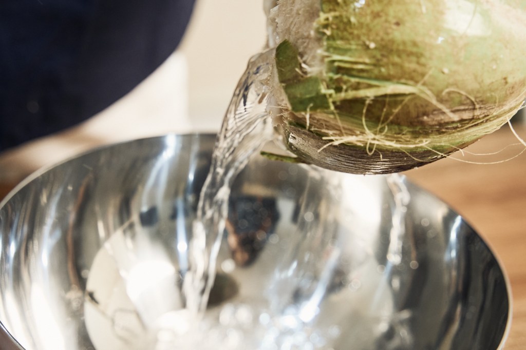 3. Fill a glass with ice and pour in the remaining 100ml of coconut juice.
