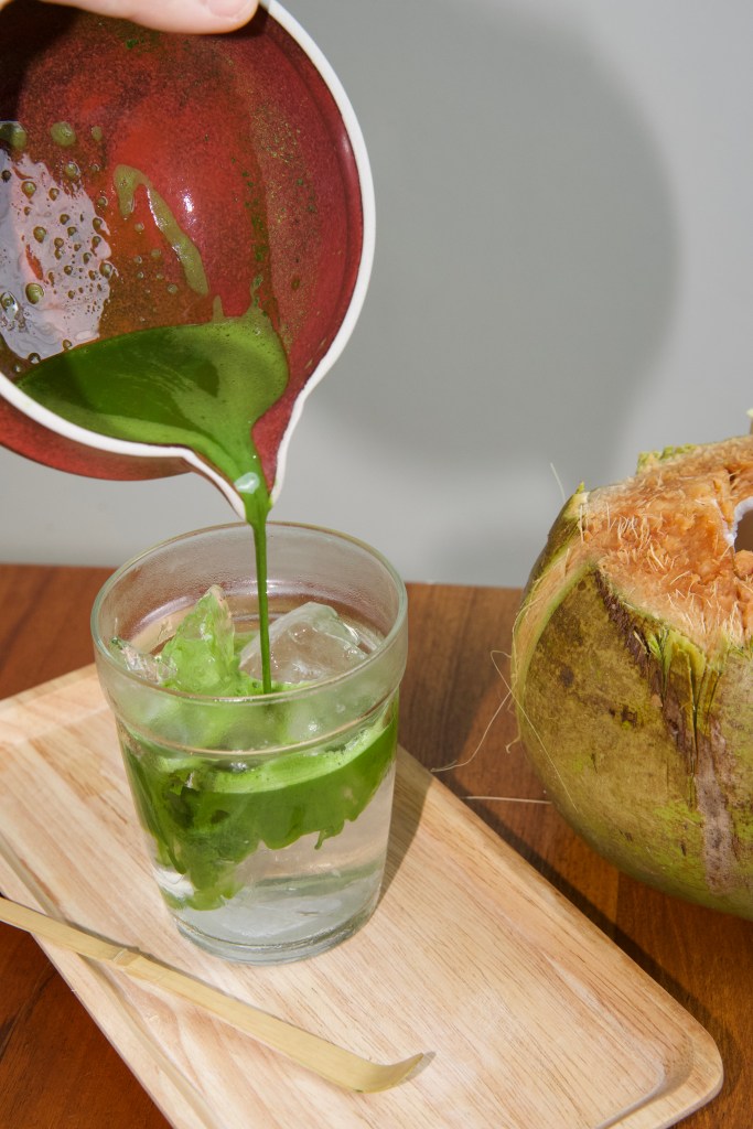 2. Add 50ml of fresh coconut juice and whisk using a chasen (matcha whisk) until smooth and frothy.